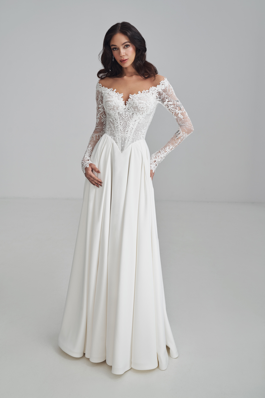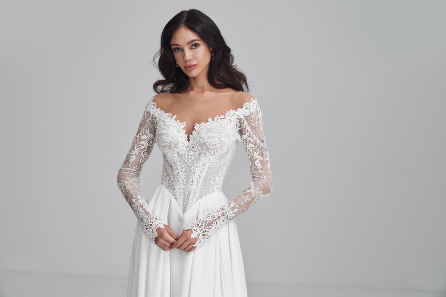 Douceur et romantisme avec cette magnifique robe à manches et son bustier en dentelle.