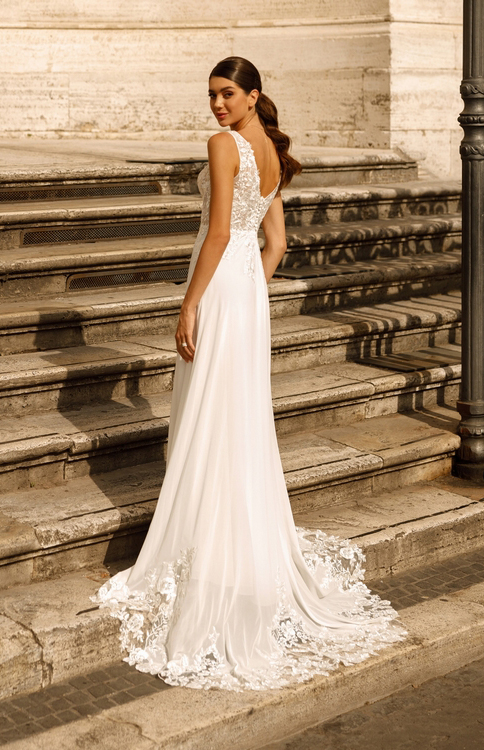Coup de cœur assuré pour cette magnifique robe bohème avec sa traîne ornée de dentelle.